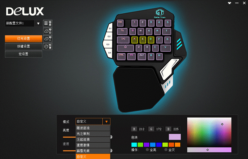 T9X的设置较为丰富,玩家可以在驱动中进行灯光、按键、宏设置,这些设置玩家一看就懂。比如你想设置一款独一无二的灯效,可以在驱动中自定义单个、多个按键的RGB灯效色彩,只要能想到的色彩都可以自行搭配。只要花点时间,就能让你的键盘与众不同。