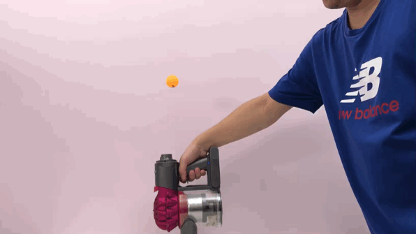 在做测试之前,我找来一个乒乓球,就不掉下来,就不掉下来……是不是很好玩?现在我们开始进入正题,因为我找来了一堆猕猴桃!注意!是“一堆”,不是“一个”,看看戴森V7吸尘器还能不能这么淡定!