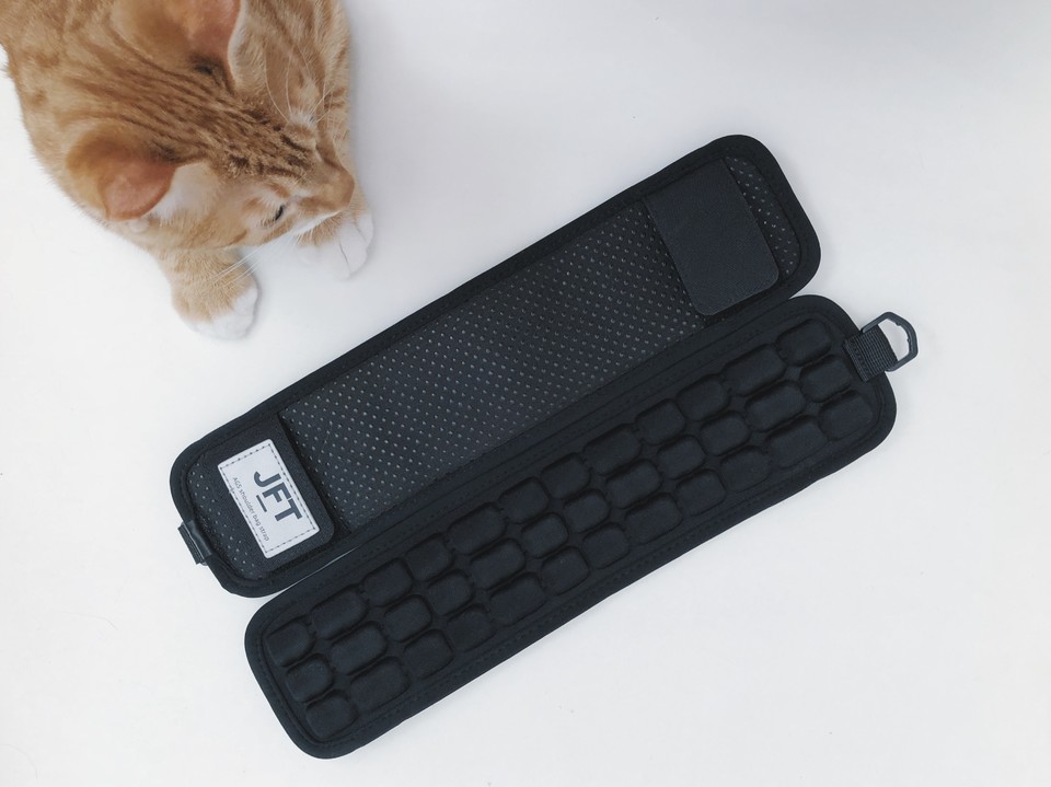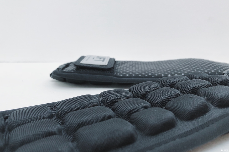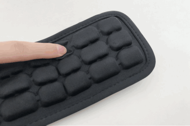 JFT 肩带模块与肩膀接触的一面,是有一个个小方格凸起的,手指戳下去会下陷,手指挪开又会恢复原状。这些个小方格就是它功能设计的核心,背负时利用气垫内气体的流动把肩膀上的压力均匀分摊。