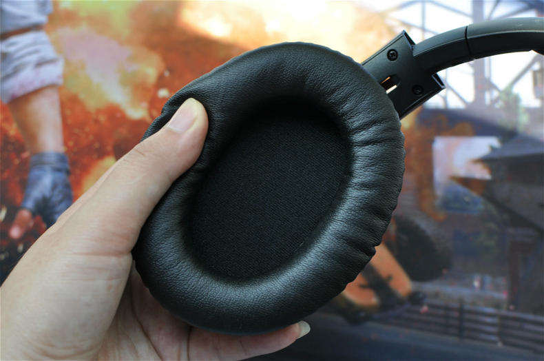 耳罩内侧展示,天箭游戏耳机的记忆海绵没那么厚实,但饱满而有弹性,皮质足够细腻,耳罩本身也够大,绝大部分的耳朵是可以轻易覆盖的;