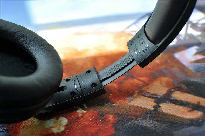 头梁外侧展示,比较宽,塑料材质,内侧有较厚的海绵内衬,佩戴感上个人觉得是金士顿里面最好的,它的设计很像毒刺,不过毒刺是棱角分明的,而且佩戴感比毒刺真的好不少。