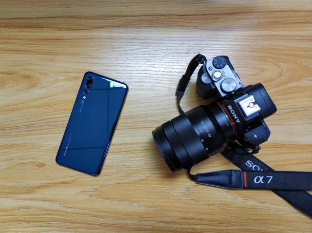 P20 Pro 是学霸君借来的,机主愤懑地说刚刚在线下排队加价 700 买到。另一边是一台 3 年前的全画幅微单索尼 A7,配套的是一个蔡司 24-70 F4 变焦镜头。
