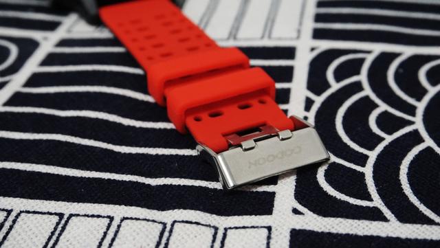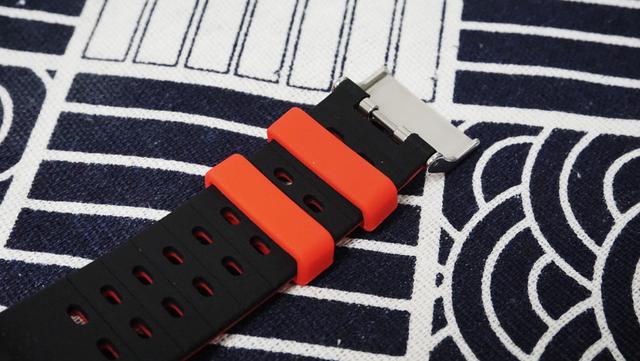 红色的表带十分醒目,一开始使用会带有点胶味,听说是采用医疗级亲肤橡胶制作。表带采用独特排汗槽结构设计,双椭圆加双圆孔排列,十六道加十道开孔,保证在日常运动时,皮肤也能自由呼吸,运动后清洗方便。