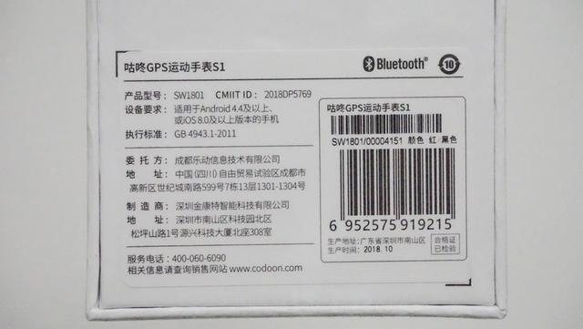 白色简洁干净的包装风格,正面为产品直视图,红色的表带,简单数字显示时间日期,顶部显示蓝牙状态和电量,外层一款刻度,运动气息十足。背面带有产品参数及厂商地址信息。
