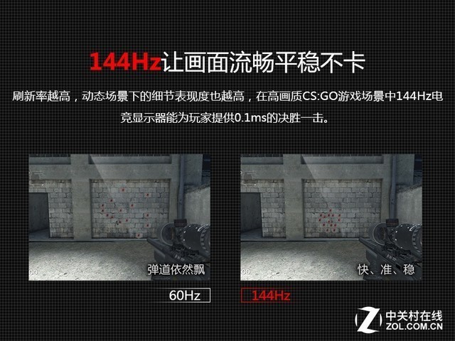 刷新率是指显示器每秒能更新多少幅画面,目前主流的液晶显示器的60Hz基本可以保证舒适的观看。但在激烈的电竞游戏对抗中,就需要快速更新场景画面,因此出现了144Hz甚至更高刷新率的显示器,目前电竞显示器的价格已经接近亲民,但在购买前还是要考虑考虑自己的配置,如果显卡支持不到高刷新率的话,买回来也无法体验高刷新率带来的流畅体验。