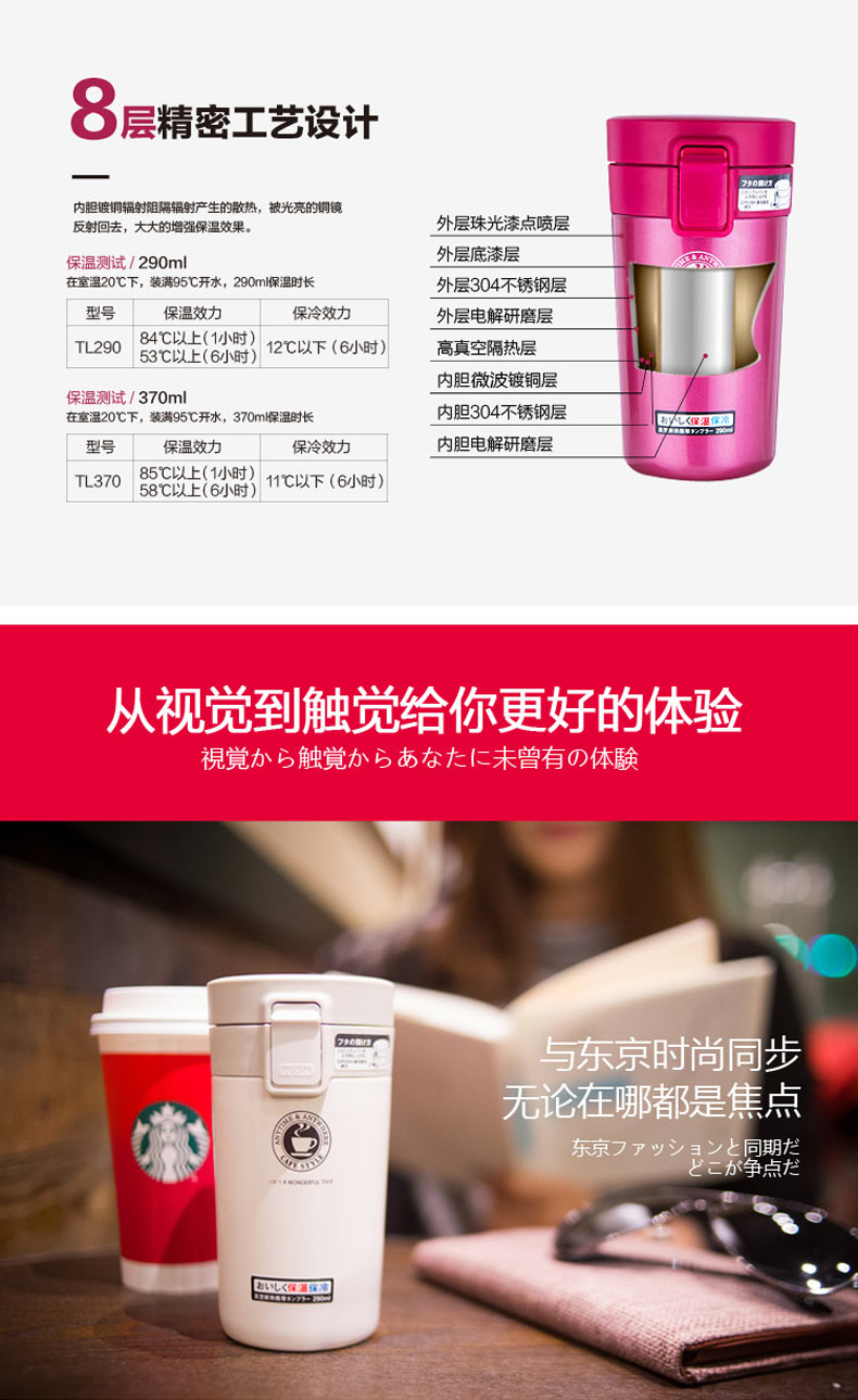 这款杯子的杯身采用了进口珠光漆面,不易磨损且防指纹。杯内运用了日本创新无缝内胆工艺,保温效果良好,同时也容易清洗,不留污渍。另外,圆滑的杯口设计,产生了良好的集水效果,再也不担心水洒一侧了~小编每次喝水啊,真是嘴歪得不行,一急起来水洒一身(捂脸,宛如一个智障。