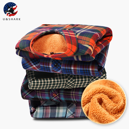 优鲨男装秋冬季男士加绒加厚长袖衬衫 男磨毛格子保暖衬衣青年-tmall.com天猫