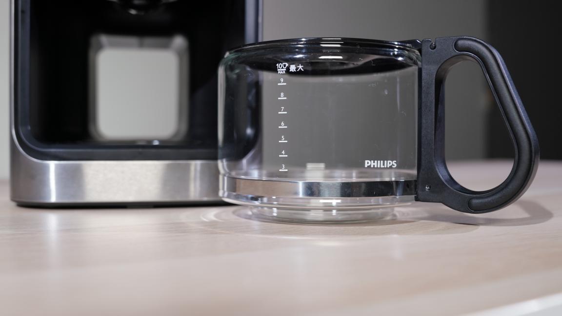 有别于其他咖啡机,HD7761因为可以一次制作10人份的咖啡,因此在下方并不是传统的设计,而是使用玻璃壶来盛放咖啡。