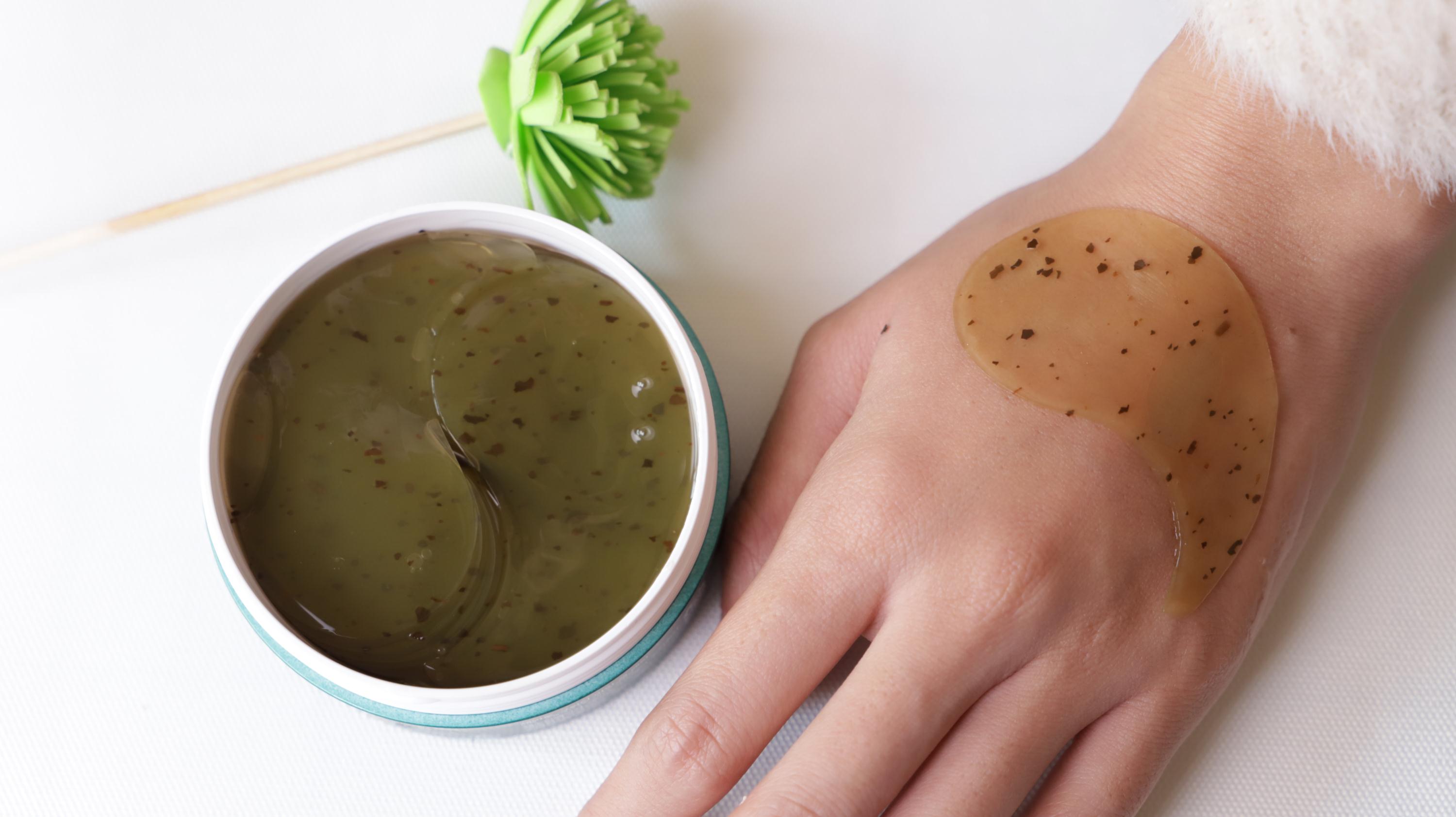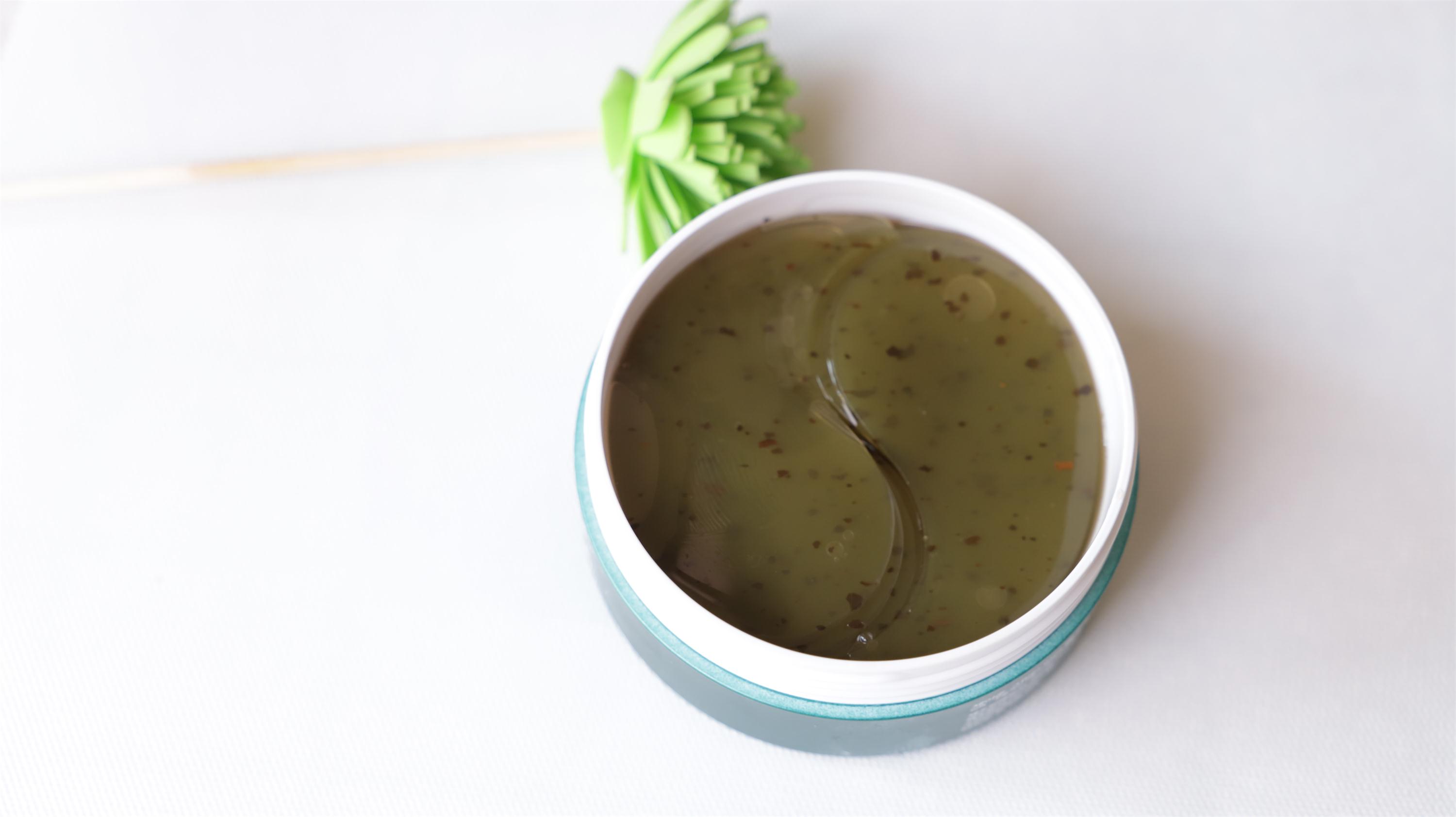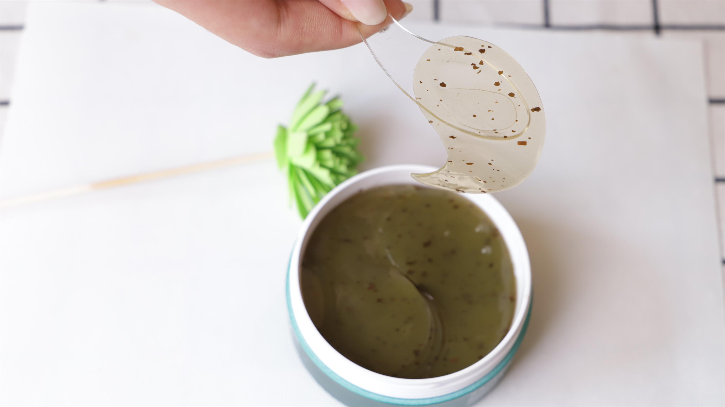 这款眼膜质地是草绿色的透明果冻,弹性十足,像一块清爽的凉糕。而且在眼膜中还能看到明显的绿茶碎,可见其真材实料。