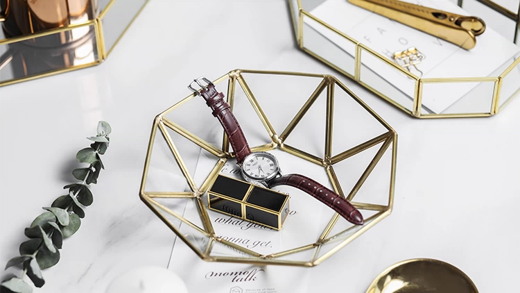 别致的镜面底盘、通透的玻璃材质,以及黄铜质感的金属边框,都使得创意收纳盒充满轻奢美感,加之流畅简洁的几何切面,更增添了一丝精致韵味。无论是用来承载杂物、收纳美妆,还是单独摆放,于桌面之上都是不错的装饰选择!