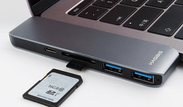 海备思这款Type-C扩展坞与上面几款不同,连接方式为“硬”连接,没有通过线将笔记本与扩展坞连接,而是直插的方式连接,提供双头款和单头款,双头款只能在新款MacBook Pro上使用。