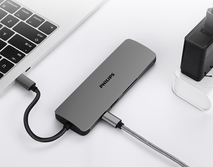 飞利浦的Type-C扩展坞同样是提供多合一功能可供选择,这里推荐八合一款提供支持PD充电的Type-C接口、RJ45千兆网卡接口、HDMI接口、USB3.0接口三个、TF/SD卡槽、VGA接口。