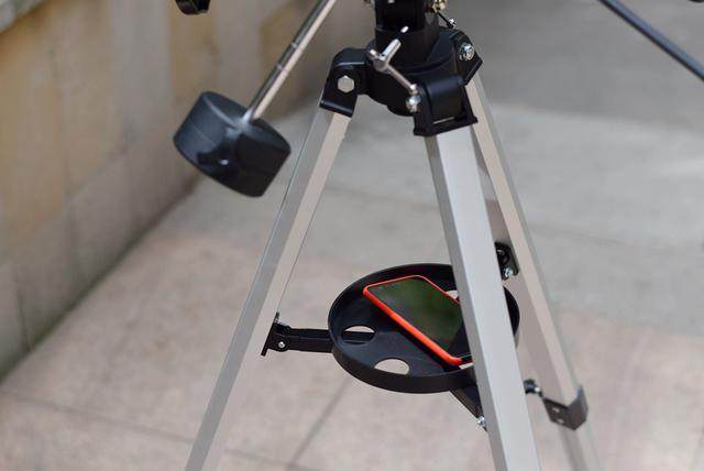 极蜂天文望远镜很贴心的在三脚架上附赠了一个附件盘,在观测过程中可以将目镜或手机放置于此,当三脚架收纳时附件盘也可拆卸,对于使用者来说非常方便。
