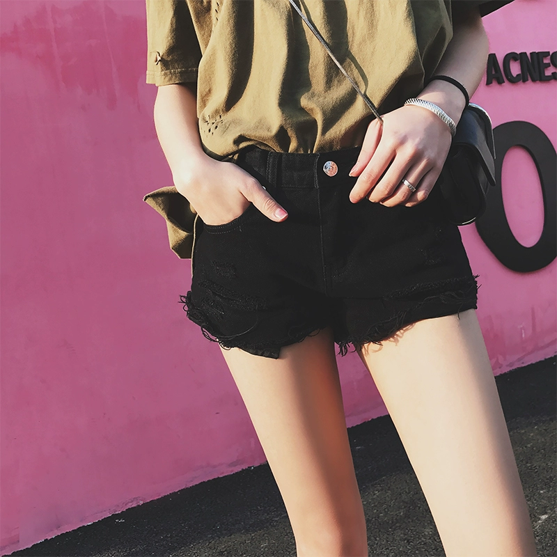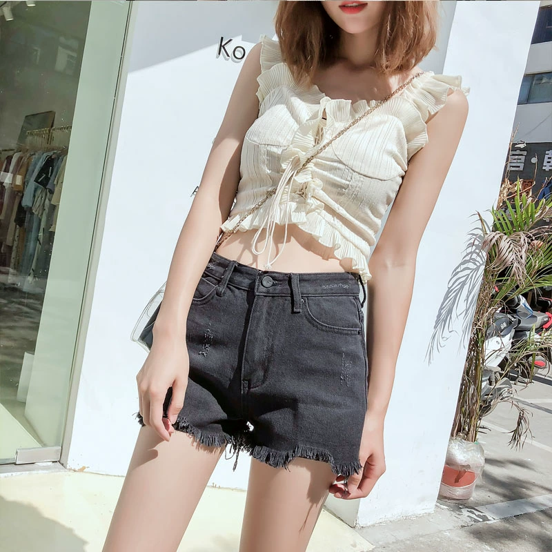 2018夏新款牛仔短裤女高腰显瘦黑灰色不规则破洞韩版白色a字热裤149元