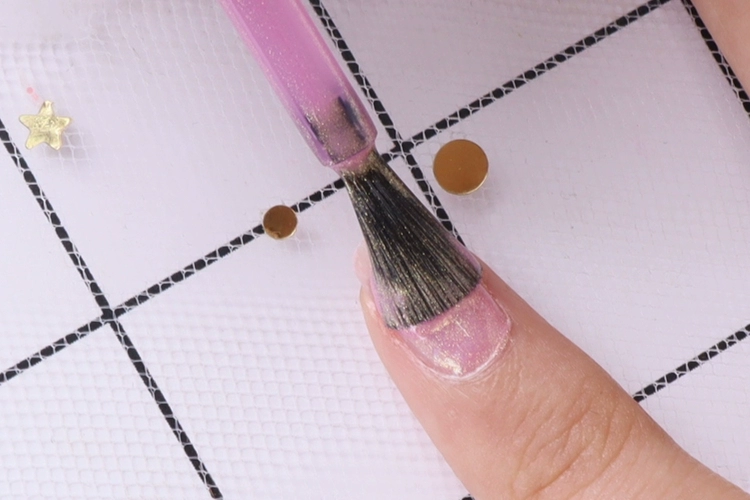 取一枚带有闪片甲油,薄薄的带过整个夹面,并用棉棒或是牙签将其中的亮片放置在两个颜色的交界处,皆可呈现整个造型的精致亮点。