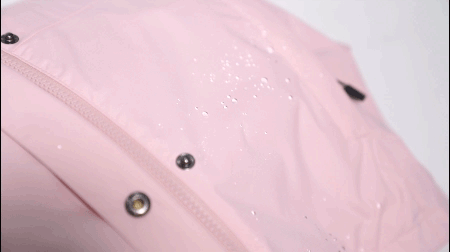 防风效果是见识过了,那么防水效果又如何呢?为了测试这款冲锋衣的防水性能,做了个小小的泼水试验。将衣服呈拱形的折叠起来,然后将水泼在上面。可以看到,水立刻呈水珠状滑落,面料并没有吸收水滴的痕迹,可见这款冲锋衣的防水性能是很出色的。