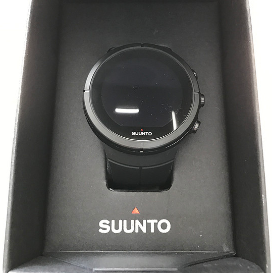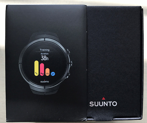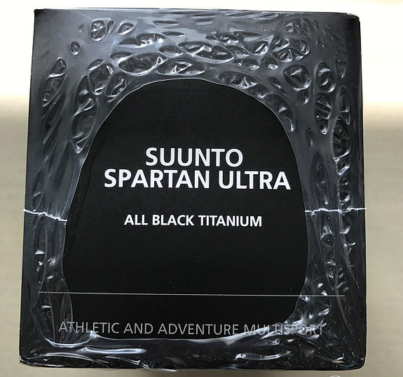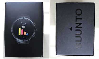 我们拿到手后拆掉塑封, 然后可以看到正面是手表的彩印,侧面两边都是suunto品牌字样,背面标识了型号、材质、颜色等, 盒子顶部写着手表型号:颂拓斯巴达极限全黑钛合金,底部贴着合格证 。