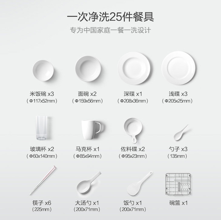 虽然看上去体积并不大,但也不能小瞧它的实力,上面这张图展示了这台洗碗机一次能洗多少餐具,如果平时家里就2-3个人吃饭,绝对是够用了。