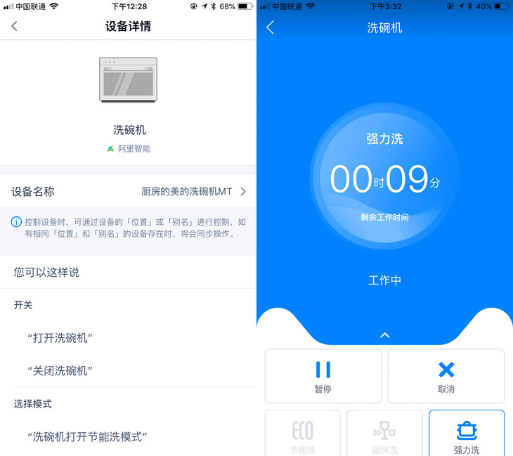 我们手里使用的是天猫精灵方糖,初次使用时需要将洗碗机与天猫精灵方糖建立连接,然后像洗碗机的开关机、模式选择等操作都可以通过语音方式来完成,不用非得待在厨房才能操作,坐在沙发上动动嘴就能实现,估计很多人都不愿意在厨房多呆一秒吧!