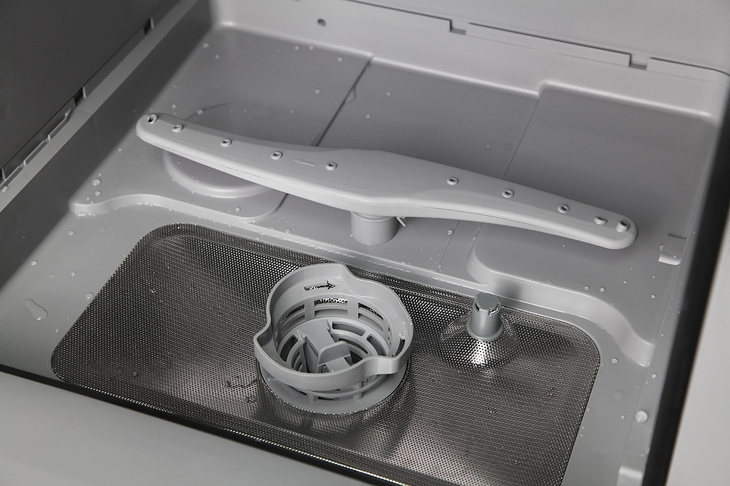 这里就是洗碗机比较核心的部件了,360度旋转的喷淋臂可以产生强劲的高压喷射水流,对餐具实现全面无死角喷刷,下面的金属滤网是用来过滤剩饭残渣,如果不想后期清理麻烦,在把餐具放进去前尽可能将它用水先冲一遍。