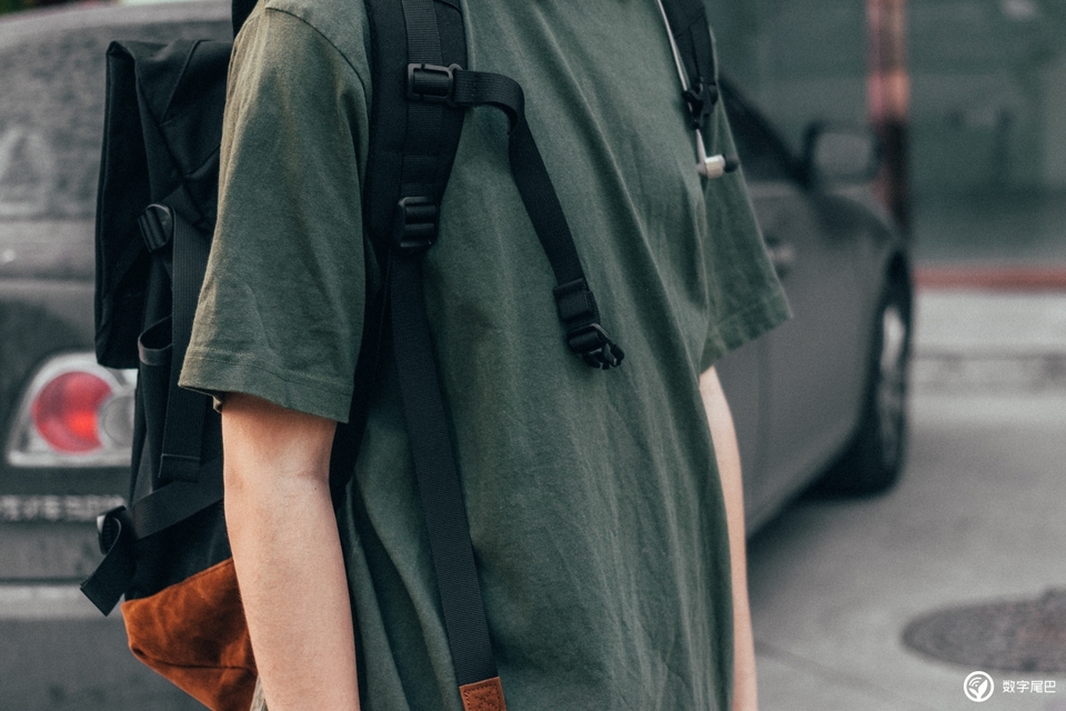 左右两侧的扣带不仅仅是起装饰效果,还可以收紧减少背包的厚度。背包的肩带还有背部都有大面积的减震海绵,透气还能舒适背负体验,肩带上也有同样的卡扣,扣起来可以分担背包肩部的压力。