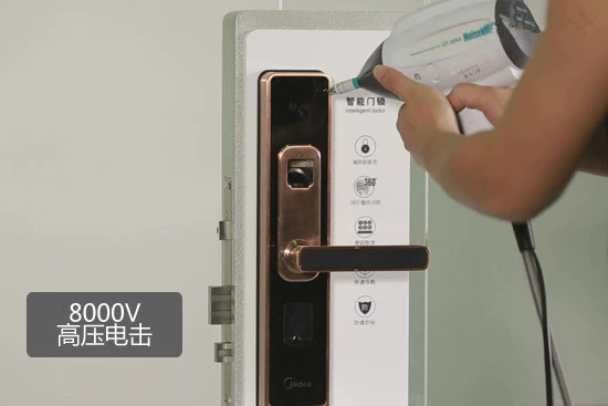 智能锁的控制主要依靠电路板和各种电子元件,而高压电所产生的磁场,或多或少对电子元件产生干扰和影响,编辑使用8000V的高压电对这款美的MOLK-LA014-M智能云锁进行电击,看是否会影响其正常工作?