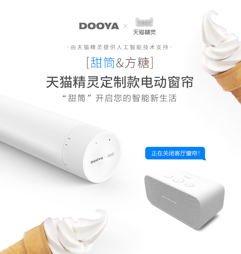 这款电动窗帘由天猫设计团队参与了产品外观的设计,采用了“甜筒”的设计理念,圆润而富有艺术感,把电动机构和智能模块都集中在整体中,从这一方面也能看到天猫精灵联合定制款杜亚电动窗帘在设计上的用心之处。