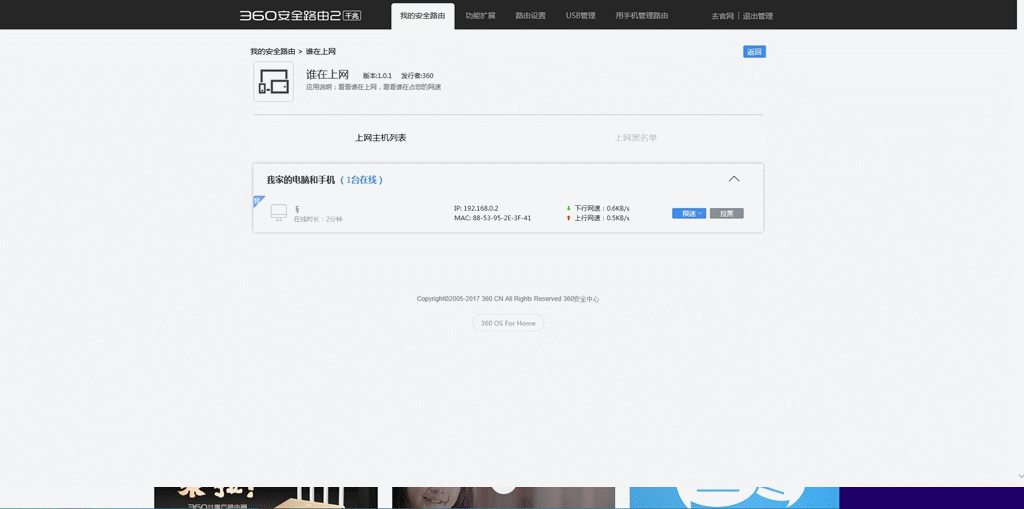 各项功能展示,在这里的操作会比APP更全面更详细,而且某些功能的设置也必须在网页端才能进行操作,比如USB的管理项目,360安全路由2 P3支持局域网文件共享,通过路由器的插件扩展,无论是手机还是电脑或者智能电视端,都可以通过局域网共享U盘里的视频或者音频文件。