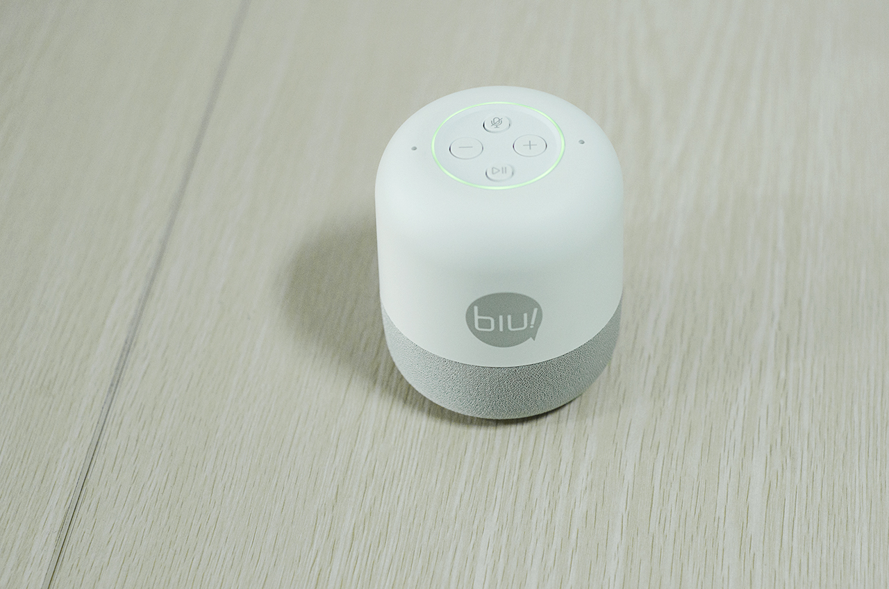 机身上有一个大大的“biu!”,算是产品的logo了。顶部和底部都有几个常用的按钮,可以做一些调节。不过,其实一旦设置好之后,通过手机App或者是直接语音控制就行,操控实体按钮的机会应该不多。