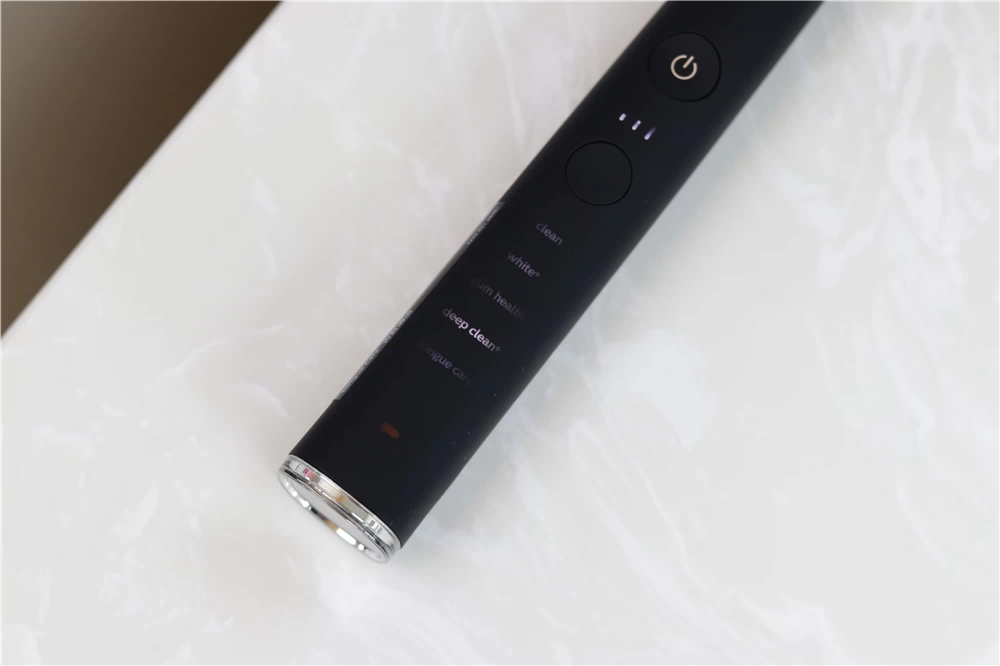 在机身的按键布局上,飞利浦电动牙刷HX9924设计也依旧简洁,两枚实体按键,一枚负责电源开关,一枚则负责调整3种不同的振动强度,和5种不同的刷牙模式。按键的手感也不错,实际使用上手也比较简单,家中大人和小孩基本都能够轻松使用。