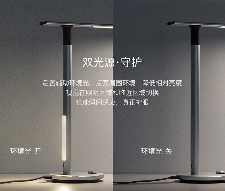 双光源的加入,可以提升护目灯背后区域环境亮度,降低阅读区与周边区域的明暗对比差,眼神在明暗之间来回移动,明暗过渡不会太激烈,环境亮度跟用眼区域亮度接近可以减少眼睛不适感,真正做到了保护眼睛。