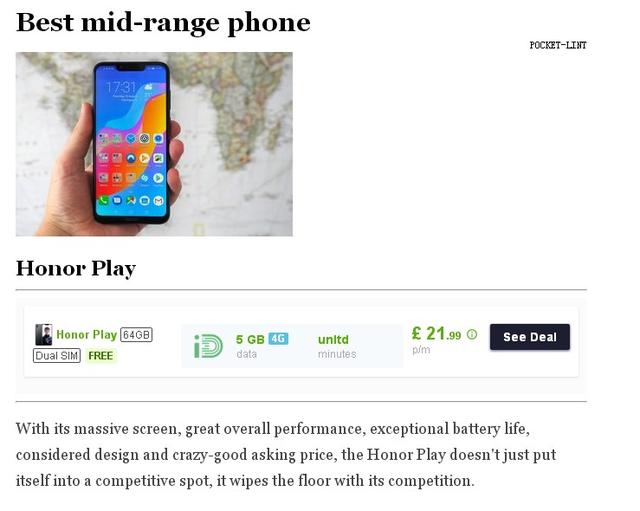 不仅P20 pro 华为的,Honor Play凭借其庞大的屏幕,出色的整体性能,出色的电池续航时间,以及其强大的性价比也获得了该榜单评选的最佳中端手机。