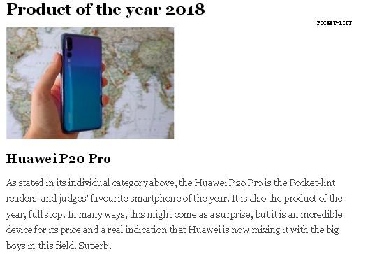 不仅如此,华为 P20 pro 还当前了该榜单的年度最佳产品