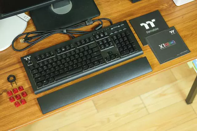 ▲全家福:键盘、腕托、说明书保修卡、8颗红色键帽、拔键器。