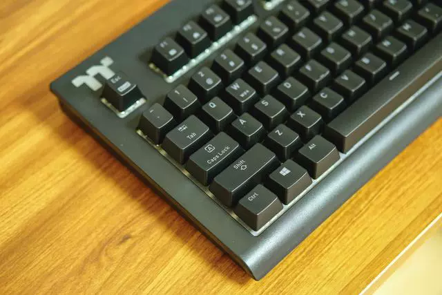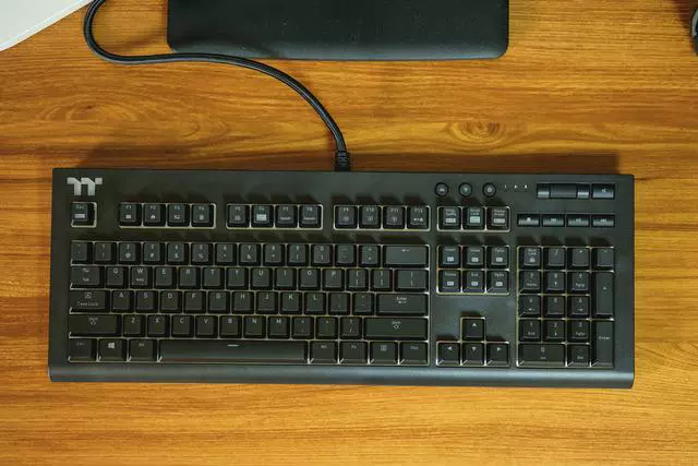 ▲键盘的造型是比较常规式的键盘布局,在右上角集中是媒体键区域,左上角则是带了RGB灯效的TT LOGO。
