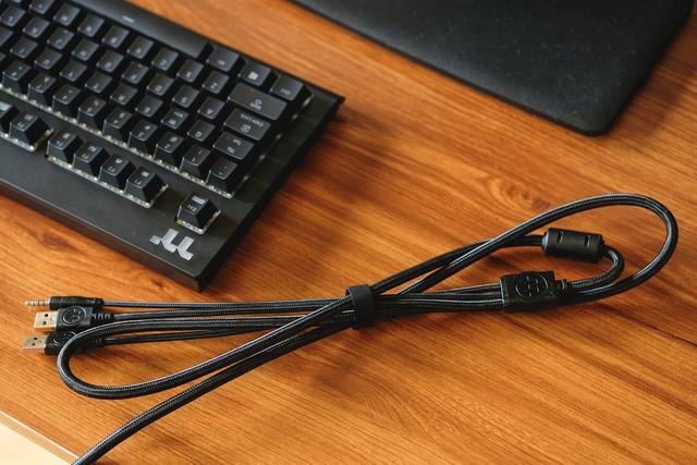 ▲在键盘的背部线缆出口的左侧是有一个USB-A接口和3.5mm耳麦接口,方便平时使用U盘或者接入耳麦,这样就不惜要弯腰插主机箱了。键盘的线缆比较粗,采用了编织线设计,提升了抗折防打卷,镀金接口带有抗磁环,在USB接口上还有标识是键盘接口还是USB Hub接口,提高识别性。