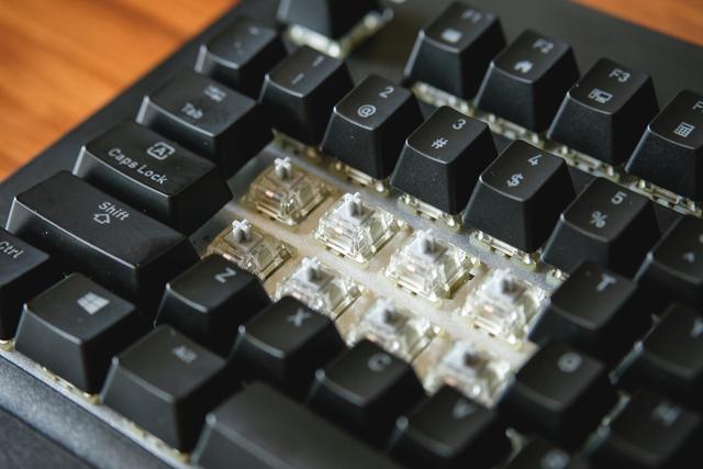 ▲使用拔键器将键帽逐个取下后,就可以看到银轴了,大键区使用了卫星轴设计,让大键的敲击时更为稳定,仔细检查了每一个轴,都是正常,没有出现臭轴坏轴。
