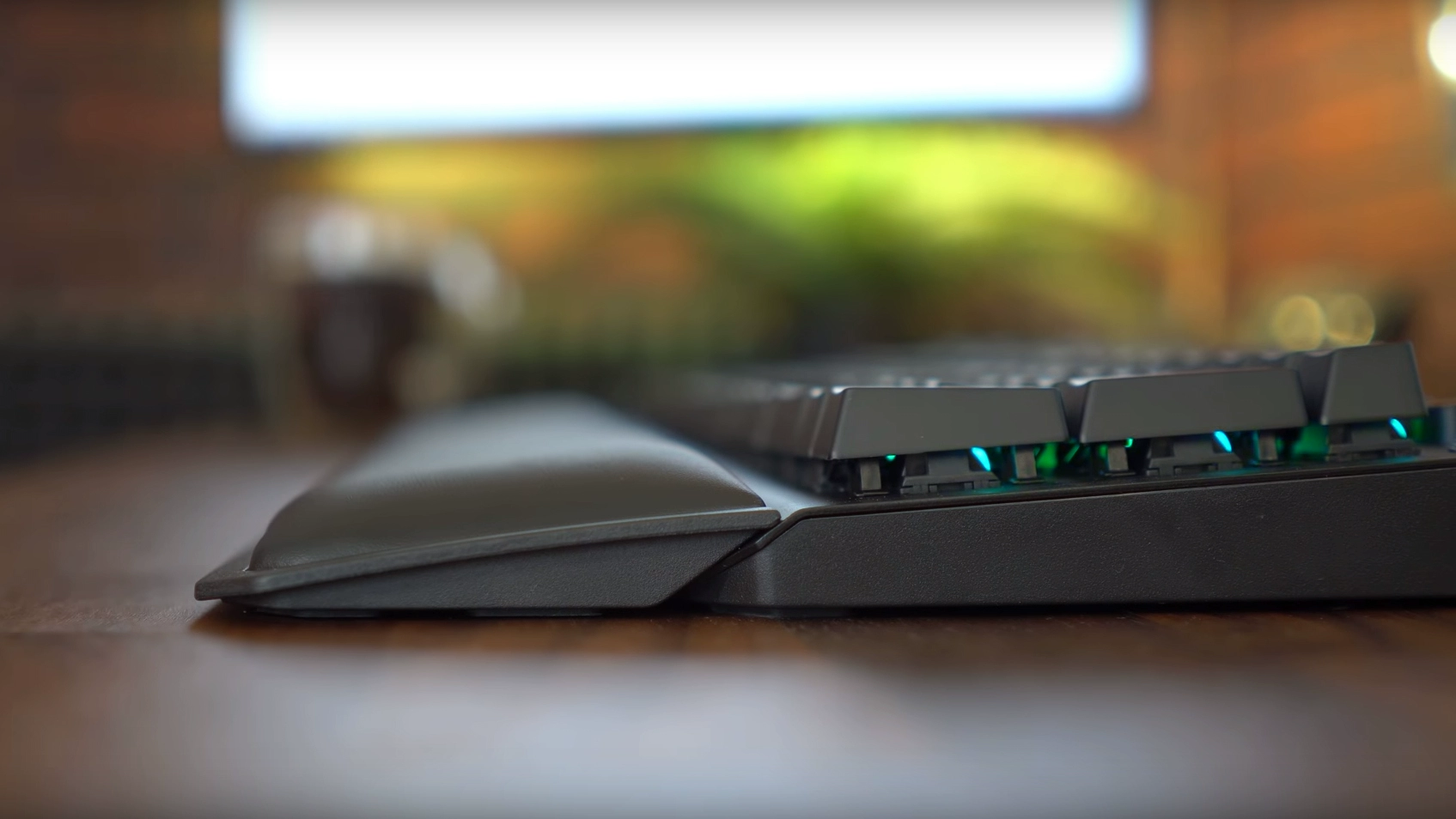 表面使用的是蛋白质皮革包裹,内部为柔软富有弹性的海绵,平时时候的时候还是非常柔软细腻,摸起来手感也非常舒适。有腕托搭配使用,玩游戏或者码字的时候手腕就不会压力太大产生酸麻。