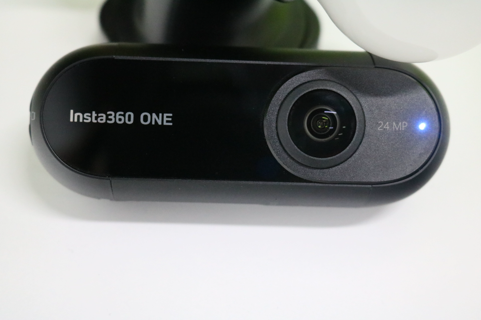 我们就称镜头位置高一点的一面为前面,镜头位置低一点的一面为后面。在前面的底部印有insta360的LOGO图标,而后面的底部则印有“Insta360 ONE”的文字标识。在前面中间,有一颗小灯珠,如果insta360在开机待机状态,这颗小灯珠就会常亮,显示蓝色灯光。