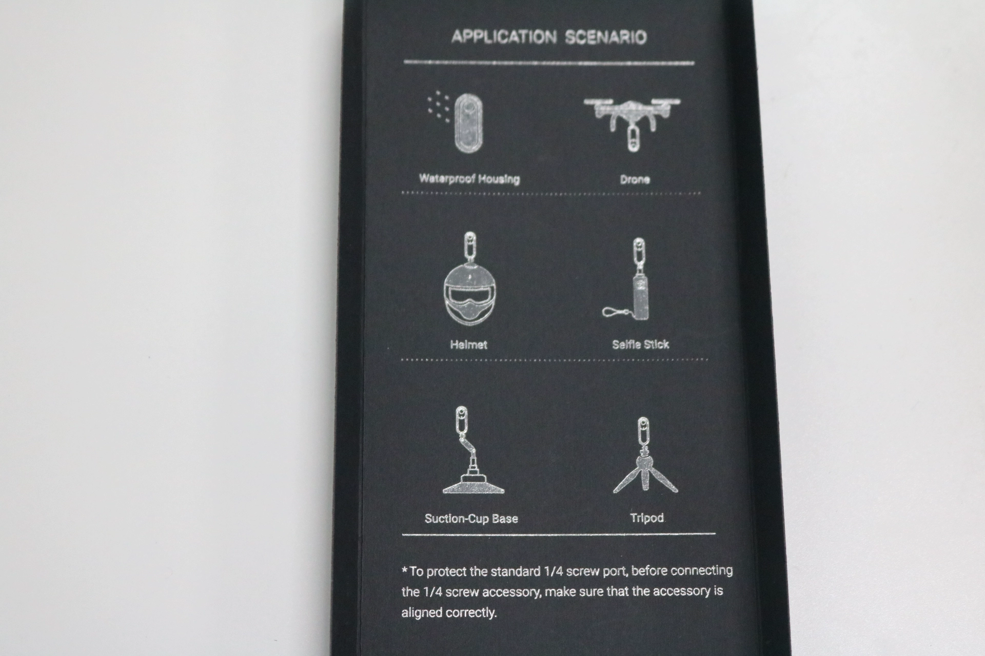 掀开盖板后,在盖板的内侧也藏有玄机。里面印有一些关于insta360的使用场景以及防水性能的图示介绍,非常的生动形象。