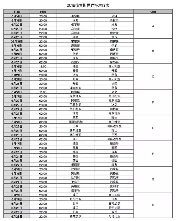 俄罗斯世界杯赛程表