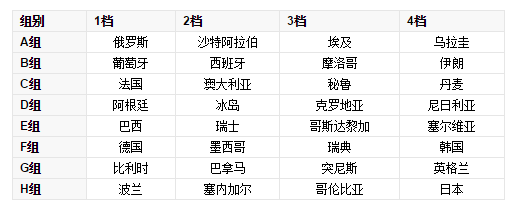 根据抽签规则,32支球队被分成4档,俄罗斯世界杯分组是把球队分为4档,每档8支球队,然后根据抽签分为8个赛组,东道主俄罗斯队被放入A组,每档位球队依次抽签分组。