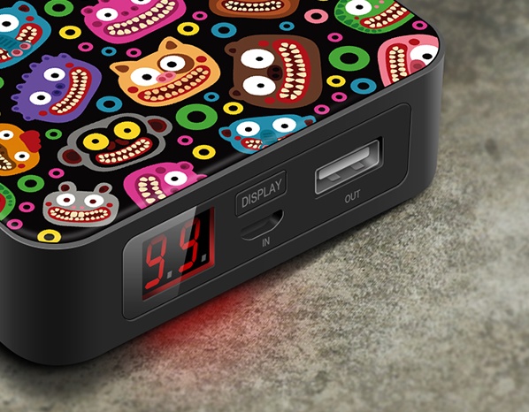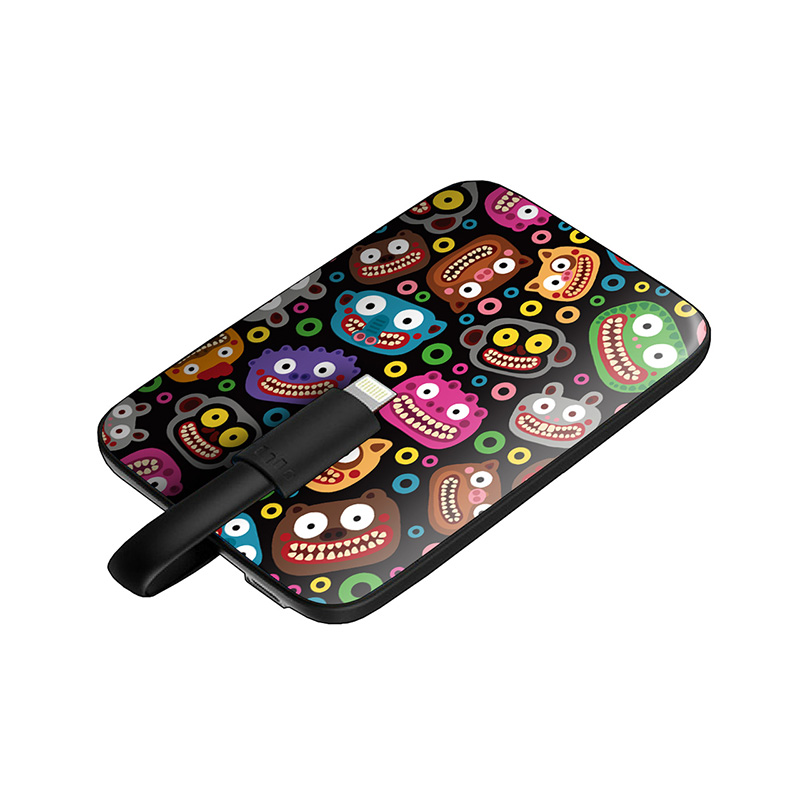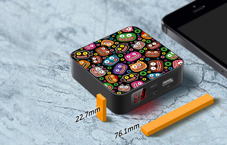 下边这款小方块充电宝,同样有很多种小怪兽可选,立体浮雕打印图案。不过这一款就没有一体充电线了。