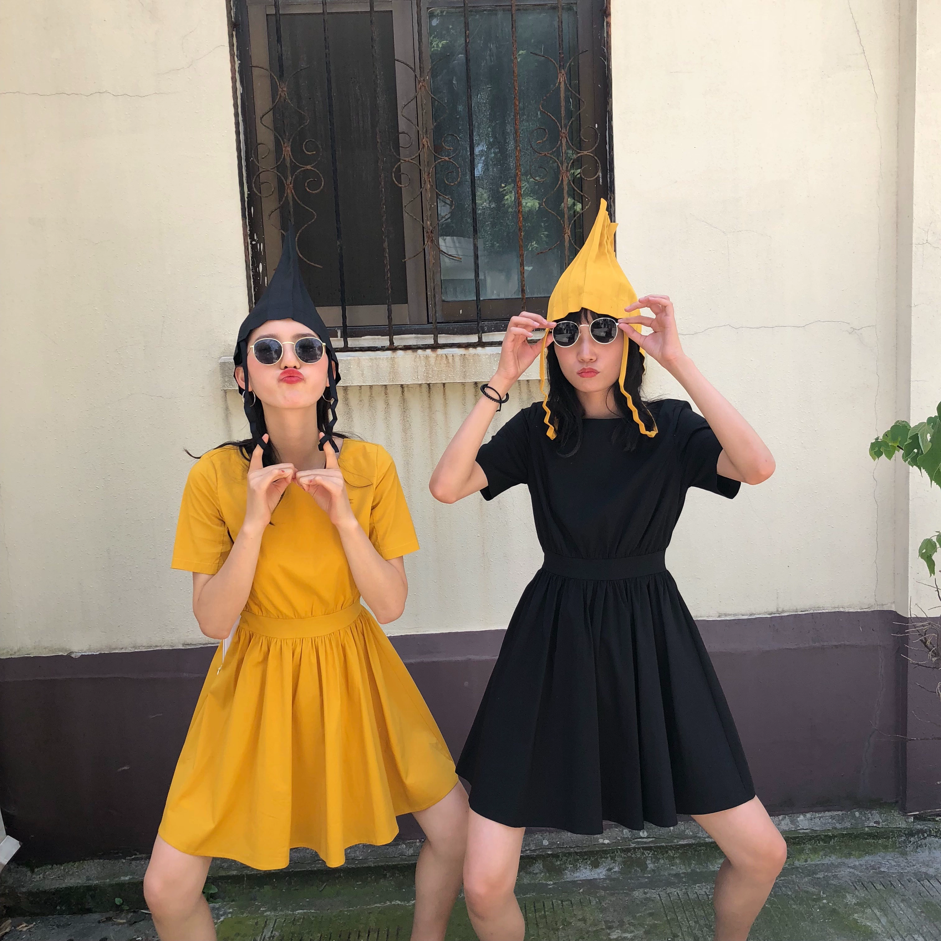 裙子夏女2018新款女装韩版休闲收腰长裙中长款黄色港味chic连衣裙99.9元
