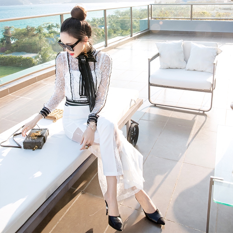 高腰小心机名媛夏装2018新款女装套装蕾丝背带裤阔腿裤时尚两件套367.5元