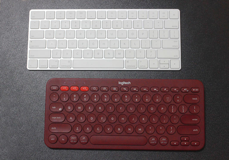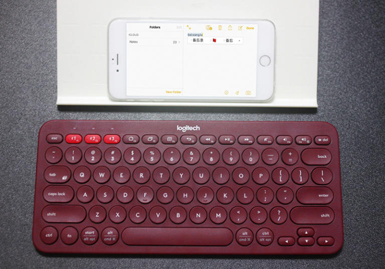 相比传统四四方方、甚至矩形的键盘来说,罗技K380圆润的造型设计给人第一印象格外小清新,非常抢眼!我选择的是红色的K380,颜色非常沉,很耐看。不到500g的机身,面积与新款苹果键盘接近,非常轻便。键程比苹果键盘要长,因此对于像我这种长期用笔记本码字的人来说会特别舒服。