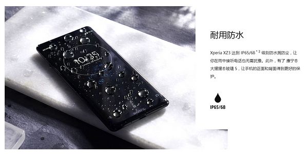 从Xperia Acro S开始,索尼便将防尘防水功能列入到手机设计的重点,索尼的Xperia XZ3这一代智能手机取消了3.5mm耳机孔后,防水防尘等级已经达到了IP65/68级别,可防水溅防尘,日常淋雨、泼洒之类的情形都不必有任何担心。