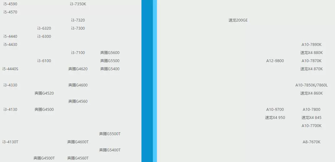 入门级处理器档位上,i3-8350k独具一档,往下是i3-8300、i3-8100,而AMD入门级档位上只有锐龙3 1300X和锐龙3 1200,而且还是上代产品。办公级处理器上面AMD倒是有速龙200GE撑门面,而且速龙200GE的位置比奔腾G5600等处理器高不少,和i3-7320处于同一水平。